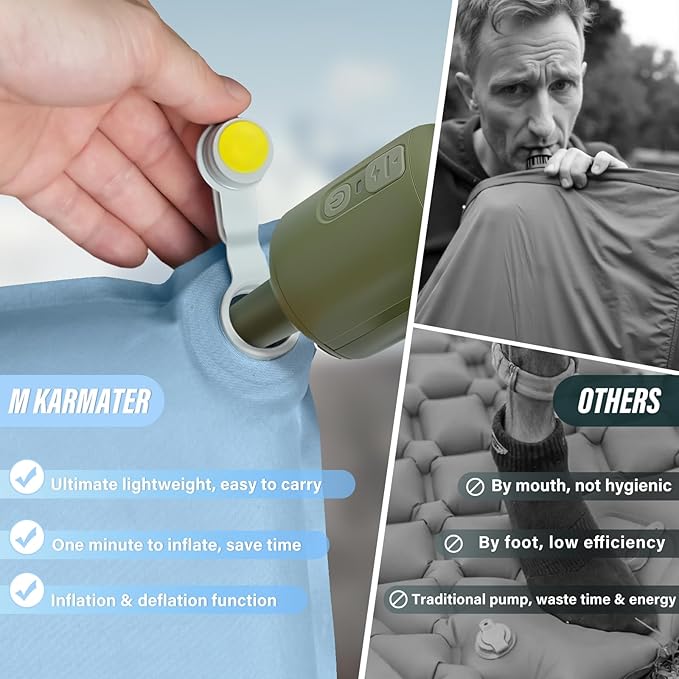- FAST POWERFUL IN/DEFLATION: It comes with an electric air pump for rapid self-inflation, it sped up the inflation/deflation process tenfold by using electric air pump, it only takes about one minute to fully inflate/deflate a single camping pad. And this pump added just 7 ounces to our pack weight, ensuring convenience and ease no matter where you are.