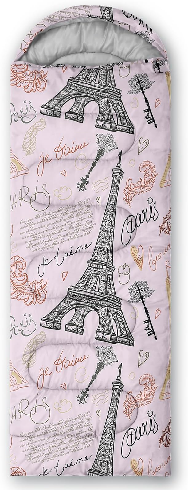 - Unique Eiffel Tower Design:This Eiffel Tower pattern sleeping bag is made of 3D digital printing with vibrant colors and patterns,size: 31W x 90L inches,temperature range: 32℉-77℉ (0℃-25℃),it also also have a weather resistant waterproof design to keep you warm and prevent you from any dampness,can be used in 3 seasons