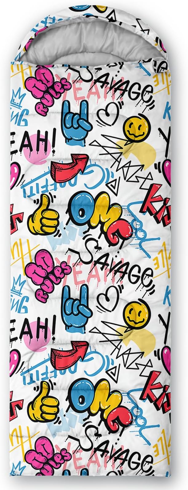 - Unique Hip Hop Design:This Hip Hop pattern sleeping bag is made of 3D digital printing with vibrant colors and patterns,size: 31W x 90L inches,temperature range: 32℉-77℉ (0℃-25℃),it also also have a weather resistant waterproof design to keep you warm and prevent you from any dampness,can be used in 3 seasons
