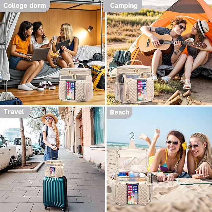 - 【Upgraded Portable Shower Caddy With Hanging Hook】This upgraded shower caddy college dorm room essentials,bring convenience to your life,Compared to the standard shower bag, it adds a separate compartment at the top for small cosmetics, toothpaste and toothbrush, the strong metal hook on the top, can hold up to 15 kg, The shower bag is high-quality and new design, classic shape and popular color, the large opening design of this makeup organizer bag is more convenient to take,and easily store your full-size toiletries, cosmetics and daily items