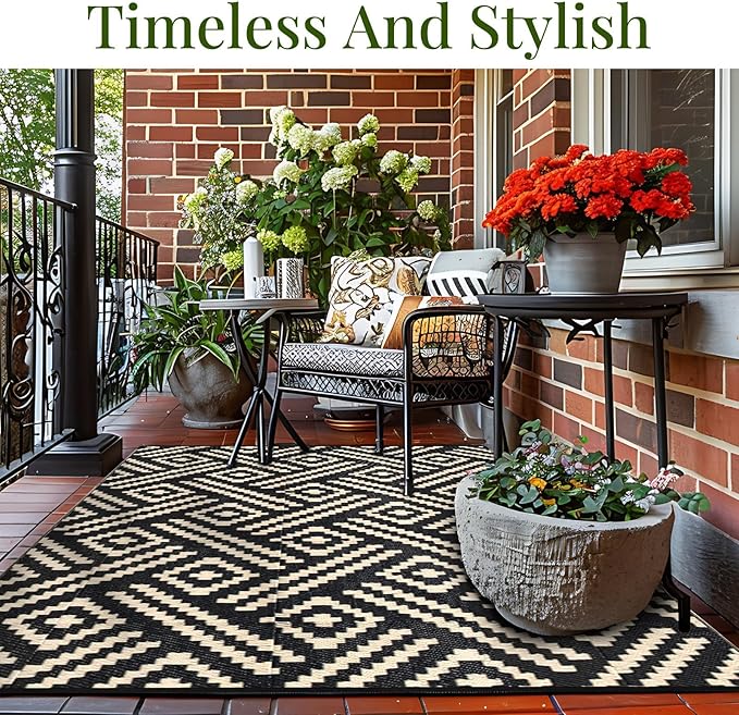 - Versatile Fit for Any Space: From cozy 4’x6’ balcony mats to spacious 9’x12’ patio covers, our washable outdoor rug adapts to your needs. Layer it under picnic tables, in trailers, or as a backyard accent—effortlessly blends with any décor