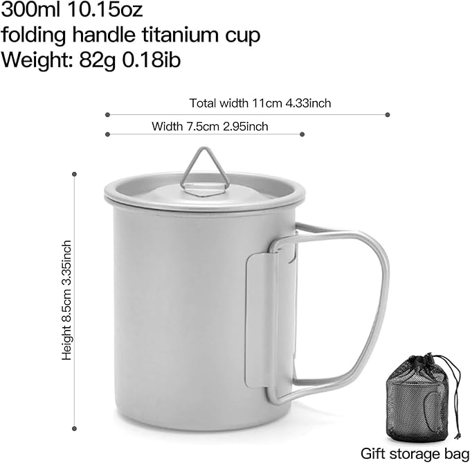 Titanium Camping Mug 300ml/10.1oz Lightweight Titanium Pot with Lid Foldable Handle Tea Cup Coffee for Outdoor Backpacking Hiking Traveling Picnic