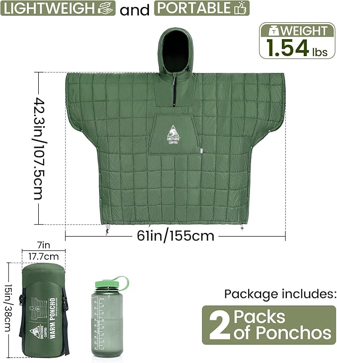 - Ultralight and Portable:: When unfolded, the honcho poncho measures 84.6 x 61 inches, but packs down to just 15 x 7 inches in its included compression sack. After folding and compressing, it becomes small and space-saving. Weighing only 1.54 lbs, this compact blanket poncho is lightweight, easy to fit in a backpack, and can even be used as a pillow, making it perfect for travel or camping