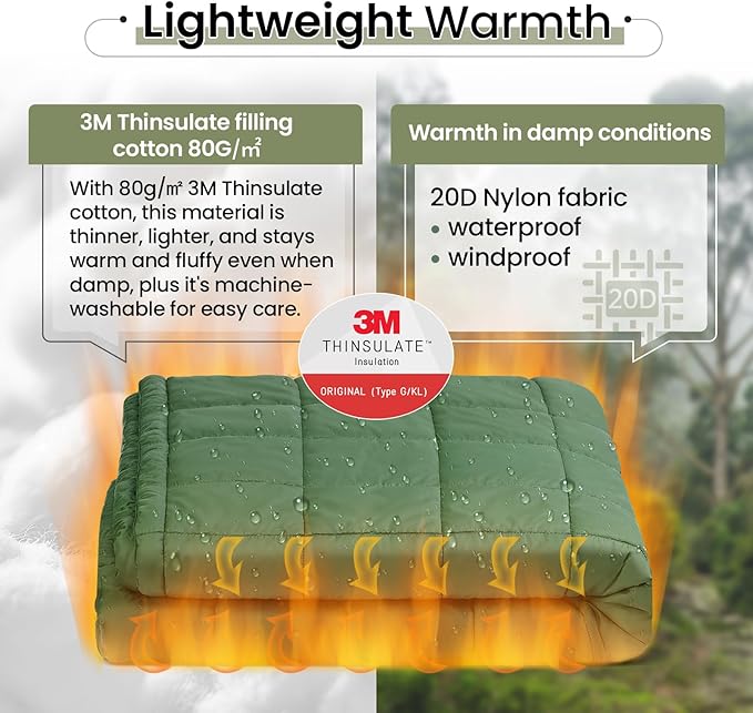 - 3M Thinsulate Insulation: Filled with 3M Thinsulate, this camping blanket delivers 1.5 times the warmth of down and double the loft of other materials.. Thin, lightweight, and machine-washable, it provides unbeatable insulation even in damp conditions, capturing body heat with ease. The 20D nylon fabric adds a soft, luxurious feel while offering waterproof, windproof, and breathable protection for all-weather comfort