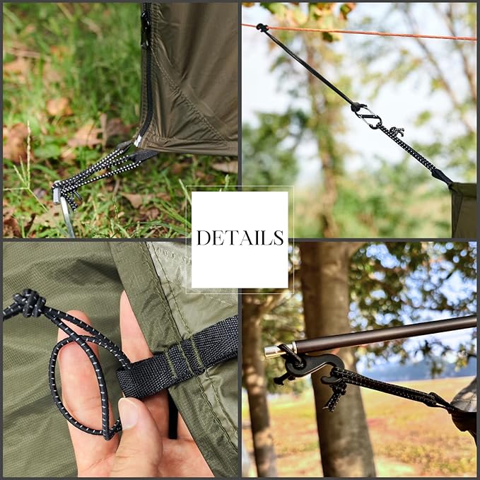 - Quick and Easy Setup: Secure a ridgeline between two trees. Attach the two pullouts on each side of the zipper to the ridgeline using prusik knots and small carabiners. Hang a sturdy stick over the ridgeline, hooking the zipper pullout and the opposite pullout onto it. Adjust the top, then stake the four bottom pullouts to the ground.