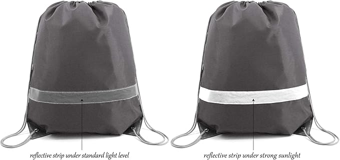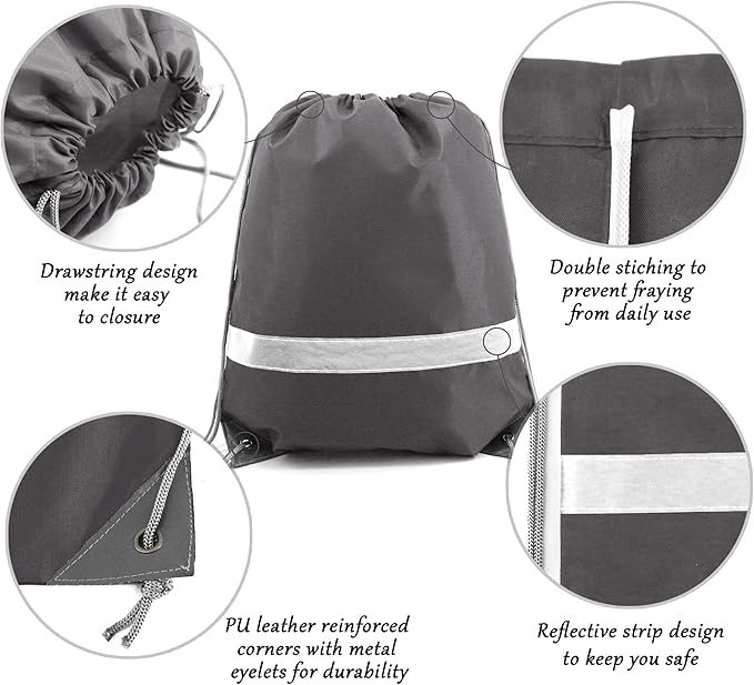 - 【STURDY & EXTRA REFLECTIVE STRIP】-- The bags are very sturdy and withstands daily wear and tear. Double stitches for all seams, making the bag is not easy to fall off and can last long. Our drawstring bags have PU leather reinforced corners, durable drawstring cords, and metal eyelets. These designs ensure that our drawstring bag is more durable. Also, the extra reflective strip can enhance the high visibility to ensure your safety while outdoor in the dark or dusk.