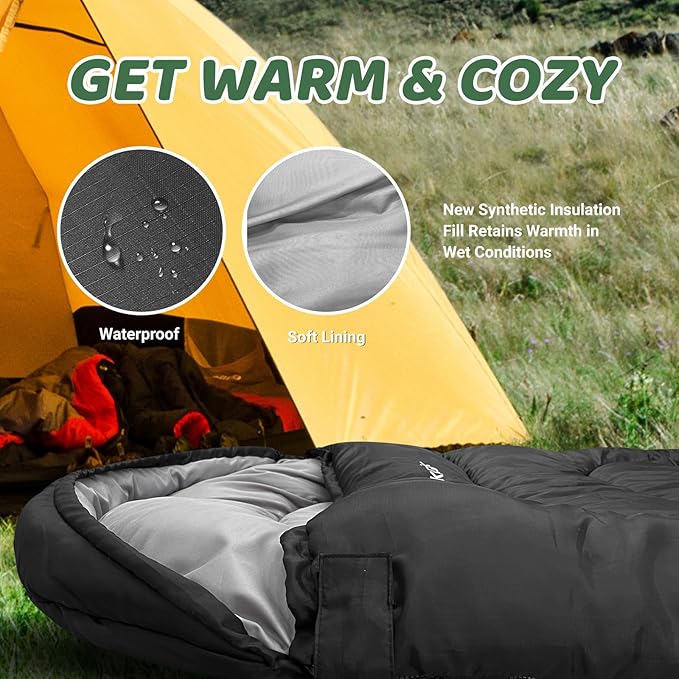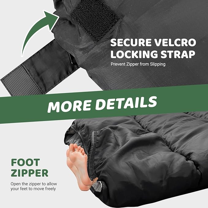 - Practical Uses: Our sleeping bags use a double zipper slider design, ideal for sliding from any position, whether you are entering or leaving, or adjusting for ventilation while you are inside. The drawstring tightens the sleeping bag cap for added warmth, keeping your head snug and protected from the cold, and the pinch-proof zipper prevents the fabric from getting caught. The detach zipper at the bottom provides the ability to open up the ventilation and keep your feet cool and comfortable