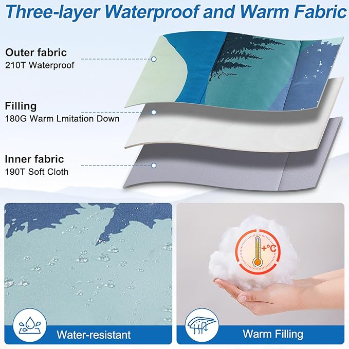 - Material: The camping sleeping bag features a multi-fabric design, with an outer layer made of 210T waterproof polyester fabric, helps you block small moisture, the inner layer is made of 190T soft cloth, while the filling is 180G warm lmitation down, providing enduring warmth; Machine washable without clumping or loss of filling
