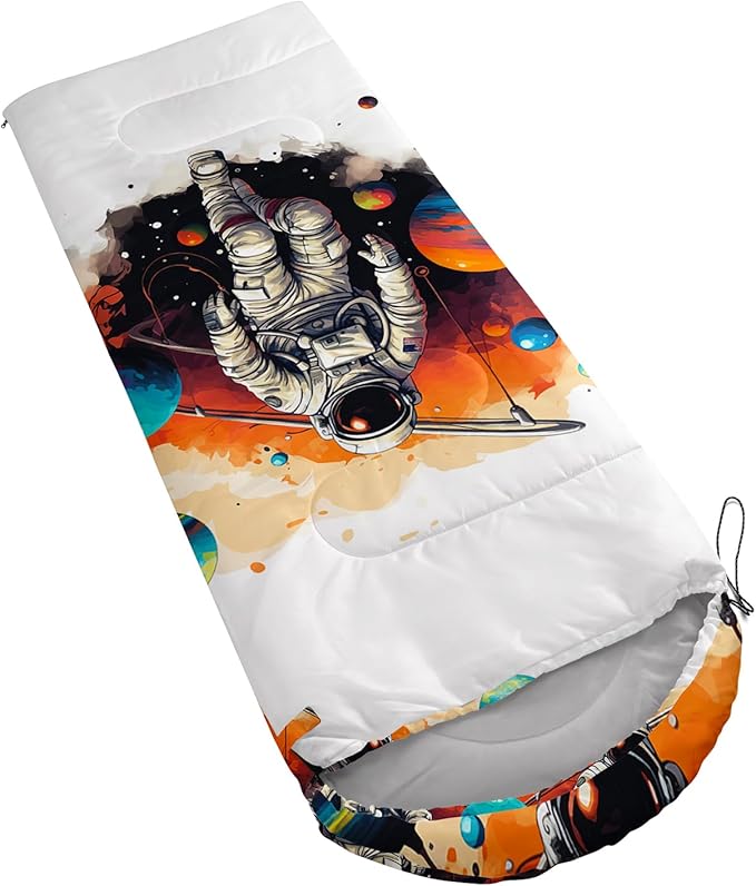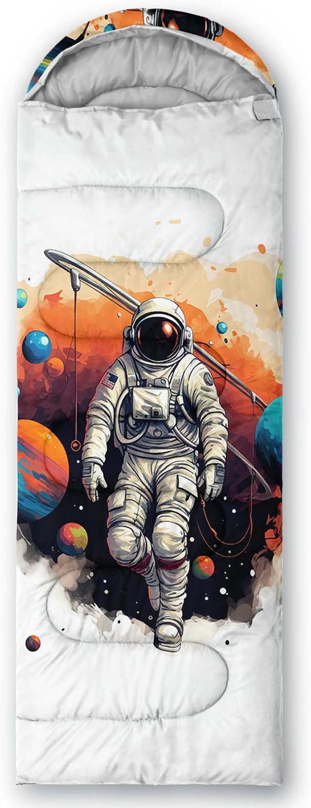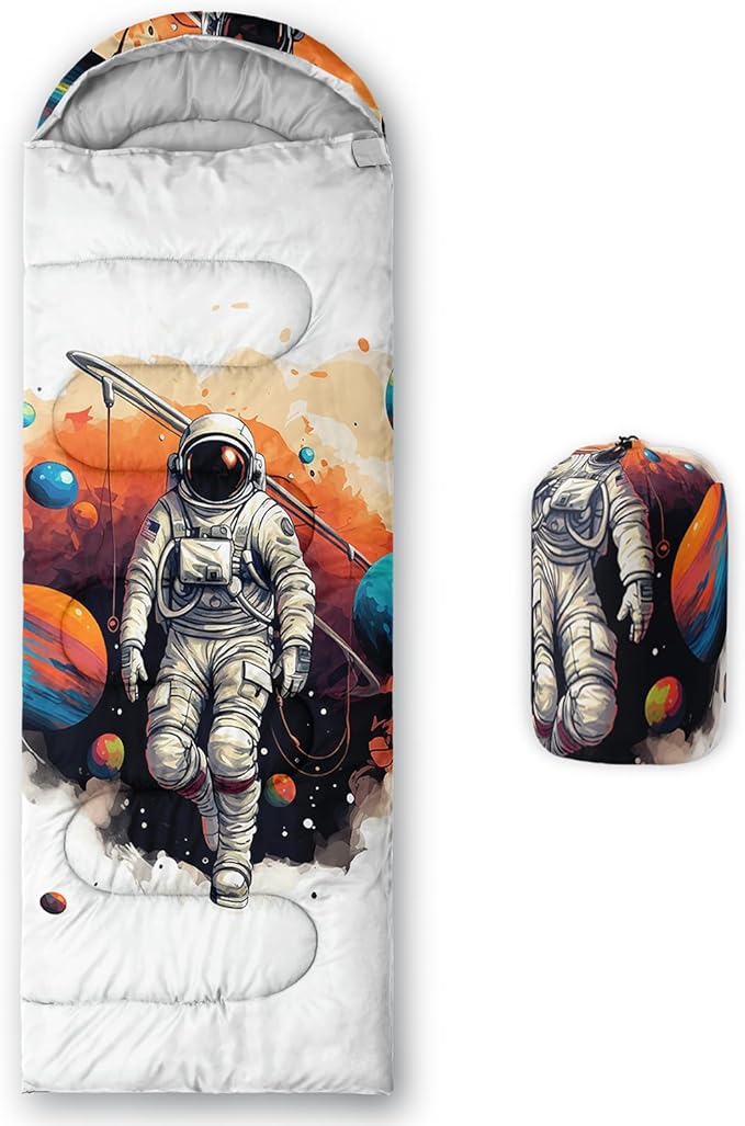 - Unique Astronaut Design:This Astronaut pattern sleeping bag is made of 3D digital printing with vibrant colors and patterns,size: 31W x 90L inches,temperature range: 32℉-77℉ (0℃-25℃),it also also have a weather resistant waterproof design to keep you warm and prevent you from any dampness,can be used in 3 seasons