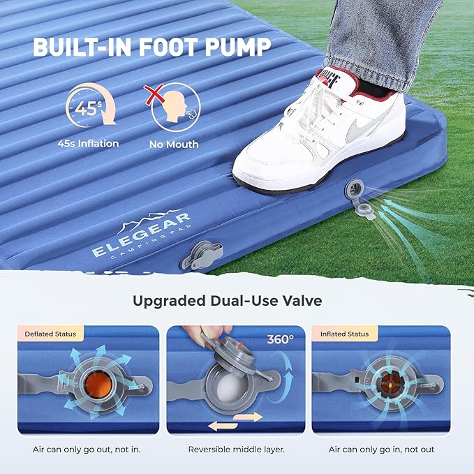 • Effortless Built-in Foot Pump: Inflation has never been easier! Our foam camping pad is equipped with a convenient built-in foot pump, allowing you to inflate it in just 45 seconds with minimal effort. The dual-layer deflation valve ensures quick and hassle-free deflation, enabling you to pack up and move on to your next destination in no time. Enjoy a seamless camping experience without the fuss of traditional pumps.