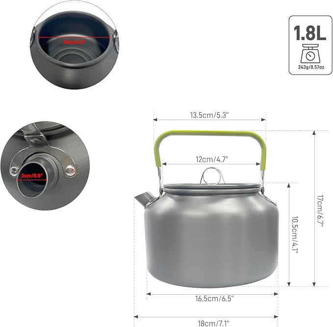 - Portable and Lightweight: Only around 0.5 lb, Capacity: 1.8L. Comes with a mesh bag, for easy storage and carrying. Can be used as a camping teapot or coffee pot, for boiling water, tea, coffee, hot drinks and soup. Suitable for indoor and outdoor use, especially for hiking, backpacking, camping, traveling, fishing and picnic.