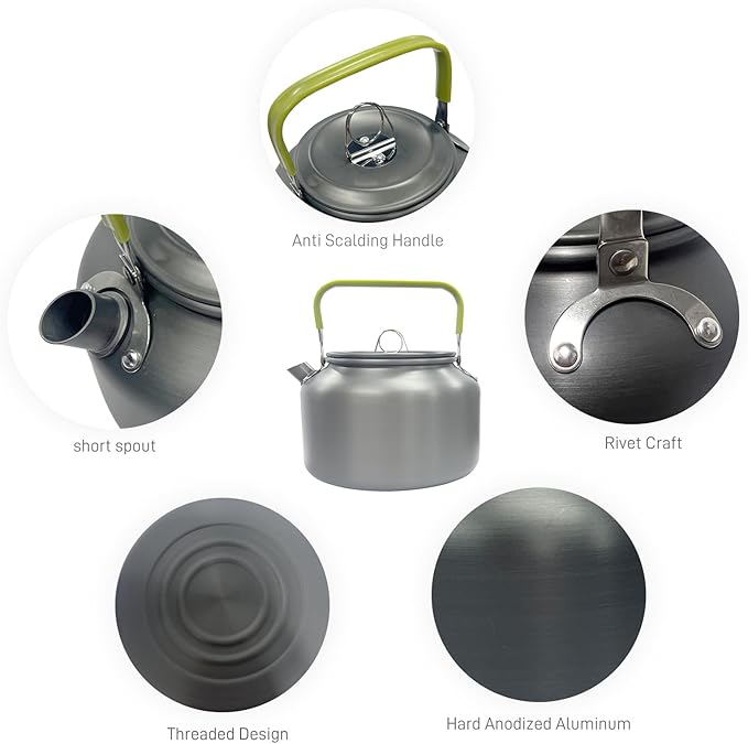 - Food-grade Kettle: This camping kettle is made of hard anodized aluminum, which makes the camping kettle have higher scratch resistance and stability than ordinary alumina. Hard-anodized aluminum conducts heat quickly,stand high temperature, corrosion-resistant, rust-free,built to last. Updated silicone-coated handle for great anti-hot effect.