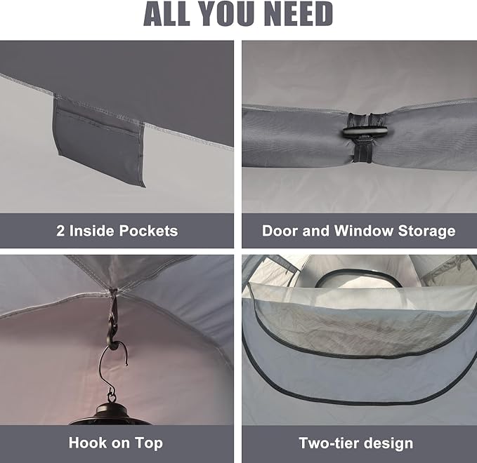 - All-Weather Protection:Stay dry and secure with high-quality 210D Oxford fabric, featuring a PU3000mm waterproof coating and fully sealed seams to prevent leaks. The sturdy fiberglass poles and wind-resistant structure ensure stability even in harsh conditions, keeping you safe in unexpected weather.