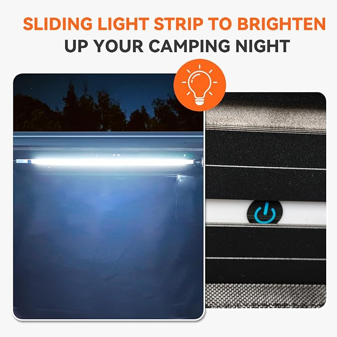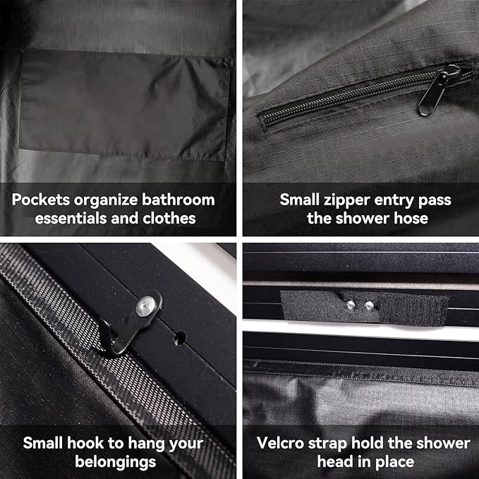 - ULTIMATE CONVENIENCE - Designed with practicality in mind, the shower awning tent includes storage pockets for essentials, Velcro tapes to secure the hose, and dual-side zippers for easy access. An integrated LED light ensures bright illumination at night. Even at night, the awning shower tent allows you to shower or change with peace of mind, offering privacy and comfort.