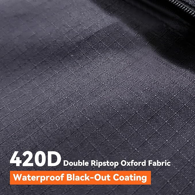 - SILHOUETTE-FREE COMFORT - Designed to eliminate silhouettes, the blackout coating ensures full privacy during showers or changing. Made from durable 420D double ripstop Oxford Fabric, the awning shower tent provides a 5,000mm waterproof rating and UPF 50+ sun protection, keeping you safe from onlookers, rain, and intense sunlight.