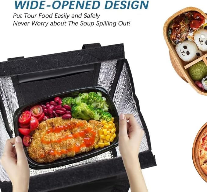 - WIDE-OPEN & VELCRO CLOSURE: the entrance of the thermal lunch box can be opened up to 9.4"L x 6.7"W big. Therefore your containers can be put into the bag and taken out of the bag HORIZONTALLY without risking leaking or spilling. Velcro closure not only makes easy access to your food but also tightly secures your foods in the bag.