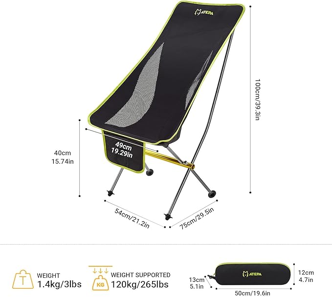 - HIGH BACK CAMPING CHAIR FOR COMFORT: Enjoy the outdoors in ultimate comfort with our premium camping chair. The head position is made of double-layer plus cotton fabric with horizontal support tube for the head to fully support your head. Featuring a ergonomically high back design, it provides a spacious seating area great for relaxation even during extended use.