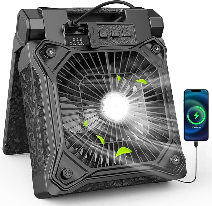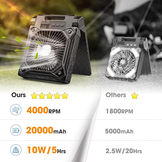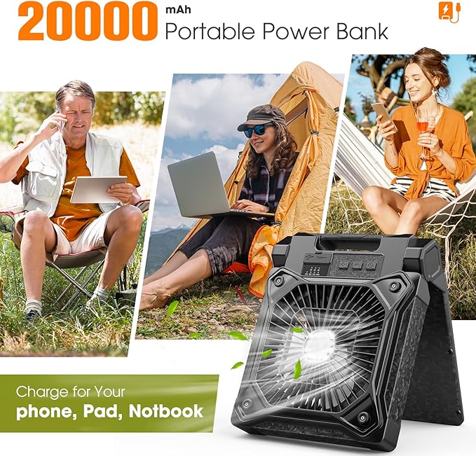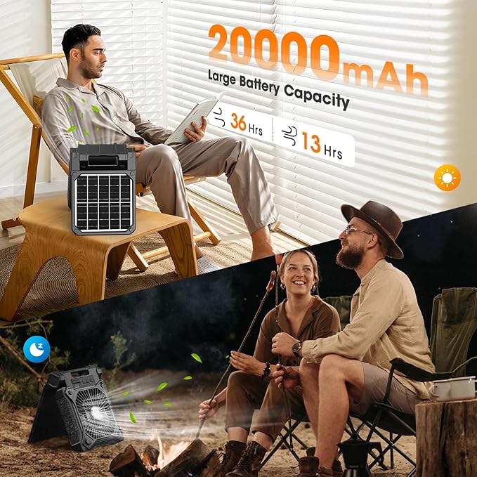 - 🌞 【20000mAh High-Capacity Battery】- Never worry about running out of power! Our solar camping fan is equipped with a 10400mAh rechargeable battery, offering 11-36 hours of continuous cooling, depending on the speed setting. It also supports operation while charging, so you can stay cool without interruption. Plus, its heat-free design ensures it’s safe for kids and pets.