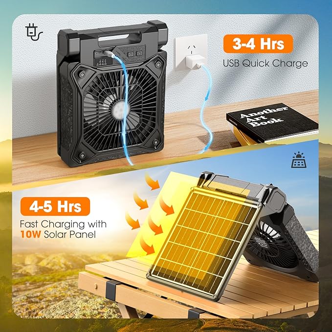 - 🌞 【10W High-Efficiency Solar Panel】- Harness the power of the sun! The built-in 10W monocrystalline solar panel delivers 23% energy conversion efficiency, charging the fan in just 5 hours under direct sunlight. For cloudy days or indoor use, the USB charging option lets you power it up in 2 hours from a power bank, laptop, or car charger.