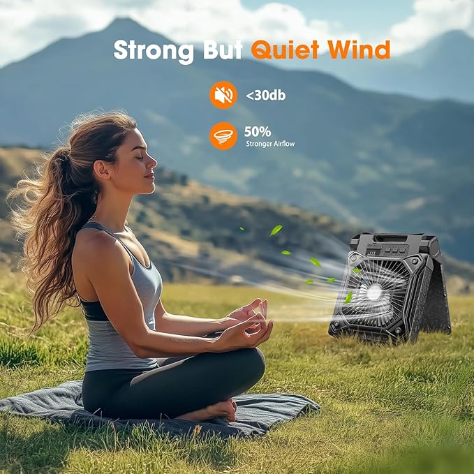 - 🌞 【Quiet Yet Powerful Airflow】- Stay cool without the noise! The solar outdoor fan’s brushless motor technology and precision-engineered blades deliver strong airflow at a near-silent <30db noise level. Whether you’re sleeping, reading, or relaxing, it’s the perfect companion for a peaceful outdoor experience.