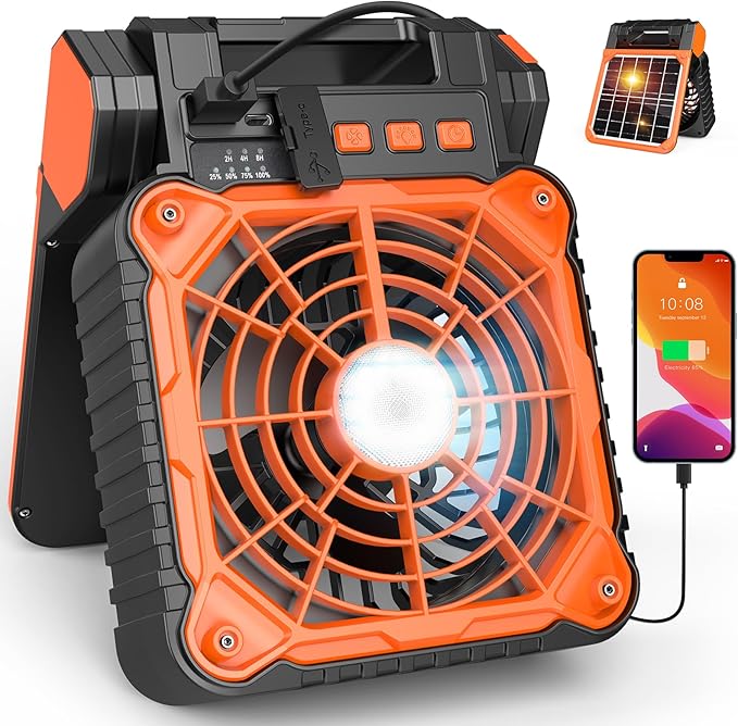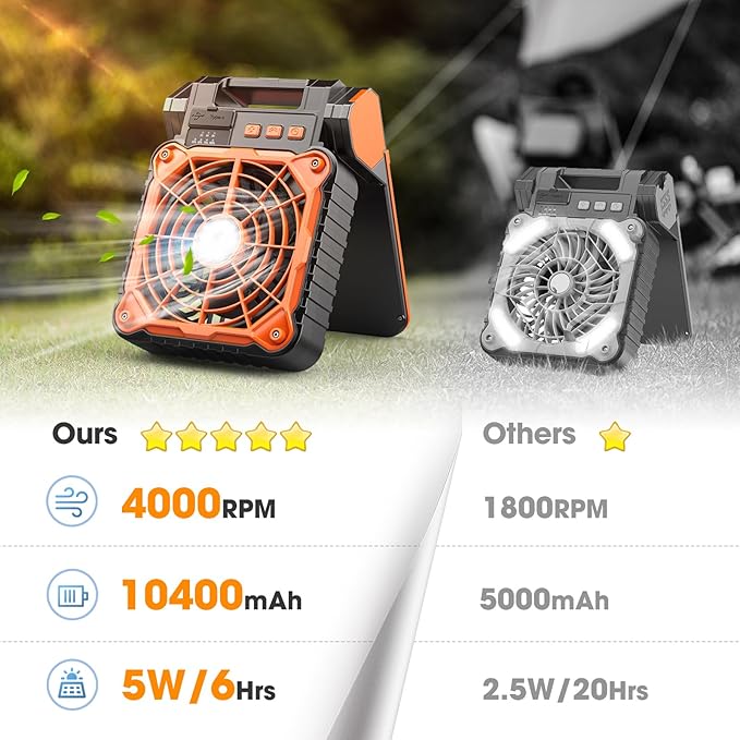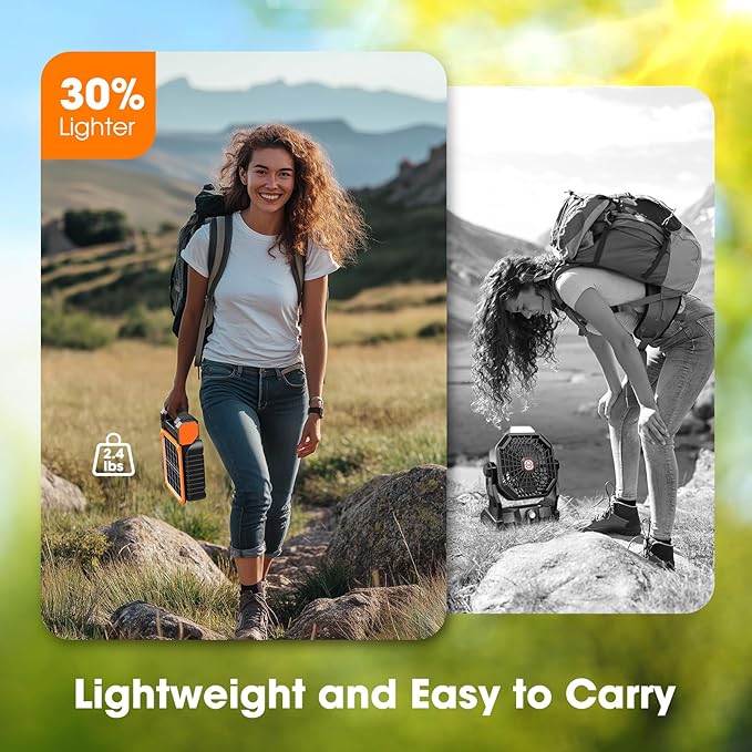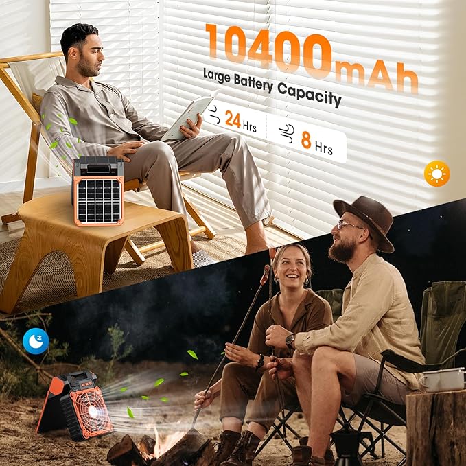 - 🌞 【10400mAh High-Capacity Battery】- Never worry about running out of power! Our solar camping fan is equipped with a 10400mAh rechargeable battery, offering 8-24 hours of continuous cooling, depending on the speed setting. It also supports operation while charging, so you can stay cool without interruption. Plus, its heat-free design ensures it’s safe for kids and pets.
