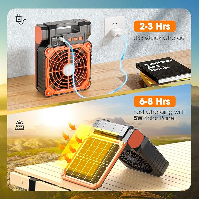 - 🌞 【High-Efficiency Solar Panel】- Harness the power of the sun! The built-in 5W monocrystalline solar panel delivers 23% energy conversion efficiency, charging the fan in just 6 hours under direct sunlight. For cloudy days or indoor use, the USB charging option lets you power it up in 2 hours from a power bank, laptop, or car charger.