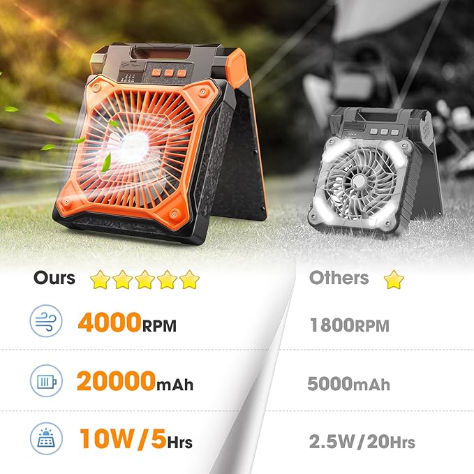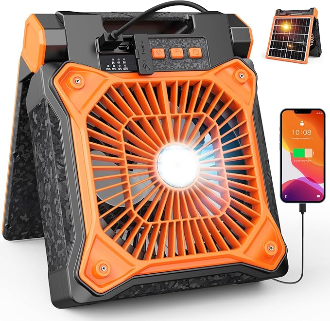 - 🌞 【All-in-One Solar Design】- ✅ Our integrated solar powered fan combines the solar panel and fan into one compact unit, making it easy to use and transport. Simply place it in the sun, and it will charge while keeping you cool.❌ Unlike split solar fans, this design is perfect for campers who value simplicity and portability.