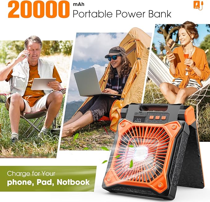 Solar Camping Fan with LED Lantern, 20000mAh Rechargeable Battery Powered with 10W Solar Panel, Quiet Battery Operated Tent Fan for Picnic, Barbecue, Fishing, Travel