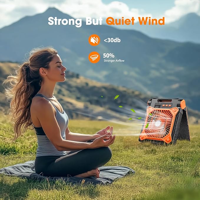- 🌞 【Quiet Yet Powerful Airflow】- Stay cool without the noise! The solar outdoor fan’s brushless motor technology and precision-engineered blades deliver strong airflow at a near-silent <30db noise level. Whether you’re sleeping, reading, or relaxing, it’s the perfect companion for a peaceful outdoor experience.