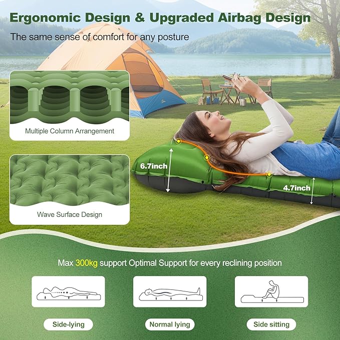 - 🏅 First Class Support With 4.7-inch Thickness - The U-shaped structure on the surface and the internal support construction ensure that your spine is optimally supported, even with a maximum load of 660lb. The 4.7" thick sleeping pad protects you from cold ground and hard stones. The ergonomic pillow area of 6.7" guarantees additional comfort for a restful night's sleep.