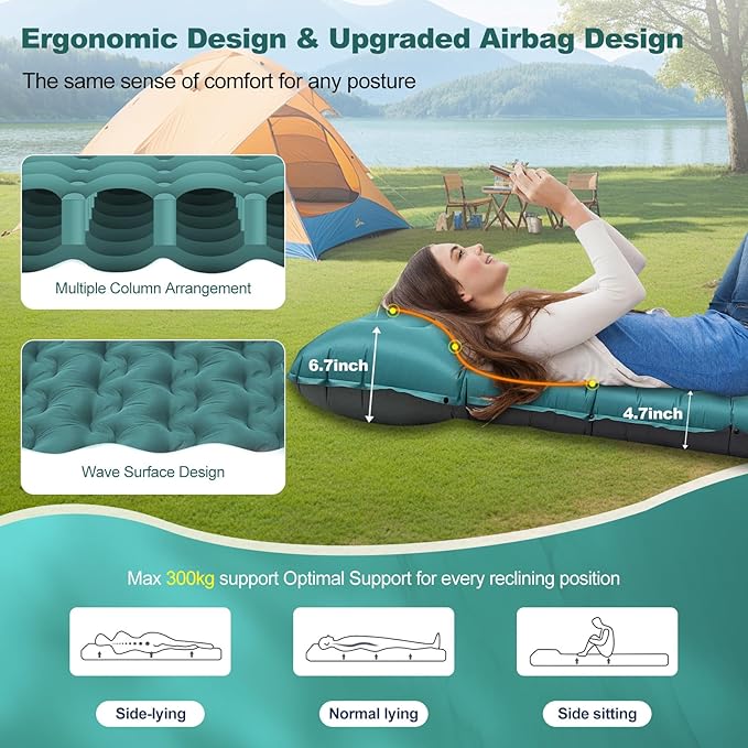 - 🏅 First Class Support With 4.7-inch Thickness - The U-shaped structure on the surface and the internal support construction ensure that your spine is optimally supported, even with a maximum load of 660lb. The 4.7" thick sleeping pad protects you from cold ground and hard stones. The ergonomic pillow area of 6.7" guarantees additional comfort for a restful night's sleep.