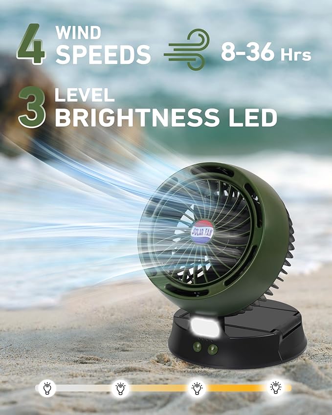 - β πππππ πππ ππππππ ππ ππππ - The solar camping fan outside features an imported motor known for its minimal friction and faster speed, delivering airflow that's 80% stronger than regular motors. This camping fan has 4 different speeds, designed to provide powerful cooling without an irritating noise. The maximum wind speed is 15 ft/s. The portable fan can work continuously for 36 hrs in speed 1, 20 hrs in speed 2, 12 hrs in speed 3, and 8 hrs in speed 4.
