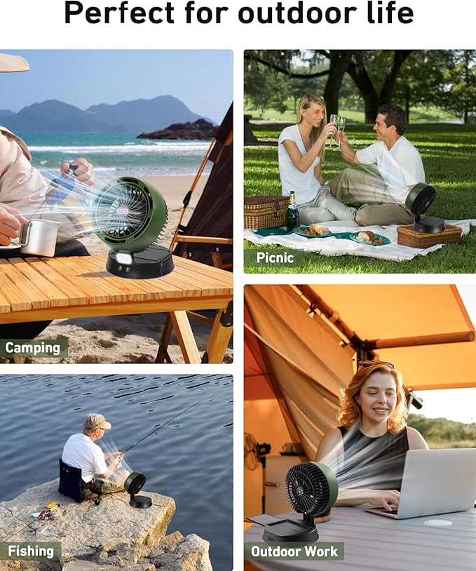 - β ππππππππππ π ππ ππππππ πππππππ - This upgraded air circulator fan, made from sturdy ABS material, serves as a tent fan, camping lantern, and emergency power bank. It ensures even airflow and illuminates your tent or campsite during nighttime adventures outside, making it a must have camping gear for all campers. This portable cordless fan can be 90Β° folded to stand as table fan, desk fan, suitable for indoor use as well for studying, working, reading, and more.