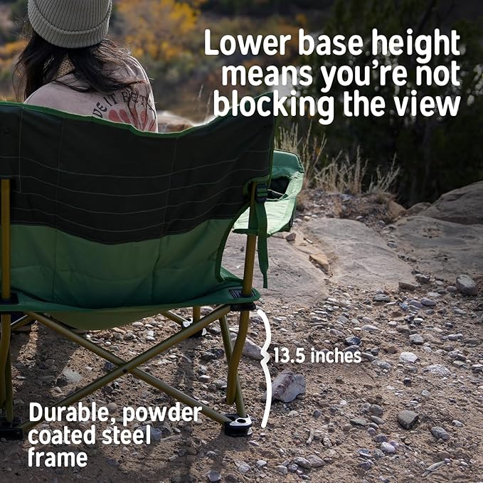 - LOW BASE HEIGHT + SLIGHT RECLINE: Like Kelty’s iconic Low Loveseat, the Lowdown Couch sits a cool 1 foot off the ground - more room to stretch out, comfortable height for pets and kids to join grab a seat, perfect height for concerts and campfires