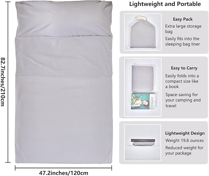 - Versatile Design: The liner works as a summer camping sleeping bag with a pillow pocket that can stuff clothes to use as a pillow. It also serves as travel bedding, replacing the need to take sheet, pillowcase and blanket. Fits most hotel bed sizes