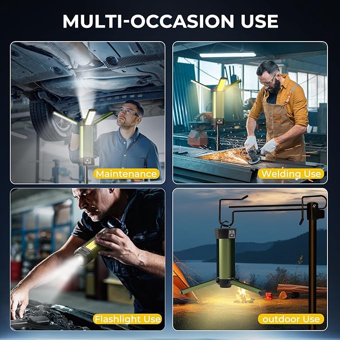 - Adjustable Height with Telescopic Stand: The portable telescopic stand extends up to 4.5ft, allowing you to customize the height based on your needs. The detachable folding tripod makes it easy to adapt the cordless work light for various working environments.