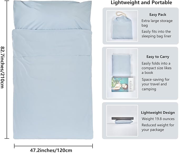 • Versatile Design: The liner works as a summer camping sleeping bag with a pillow pocket that can stuff clothes to use as a pillow. It also serves as travel bedding, replacing the need to take sheet, pillowcase and blanket. Fits most hotel bed sizes