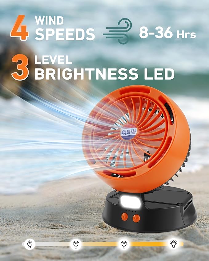 - β πππππ πππ ππππππ ππ ππππ - The solar camping fan outside features an imported motor known for its minimal friction and faster speed, delivering airflow that's 80% stronger than regular motors. This camping fan has 4 different speeds, designed to provide powerful cooling without an irritating noise. The maximum wind speed is 15 ft/s. The portable fan can work continuously for 36 hrs in speed 1, 20 hrs in speed 2, 12 hrs in speed 3, and 8 hrs in speed 4.