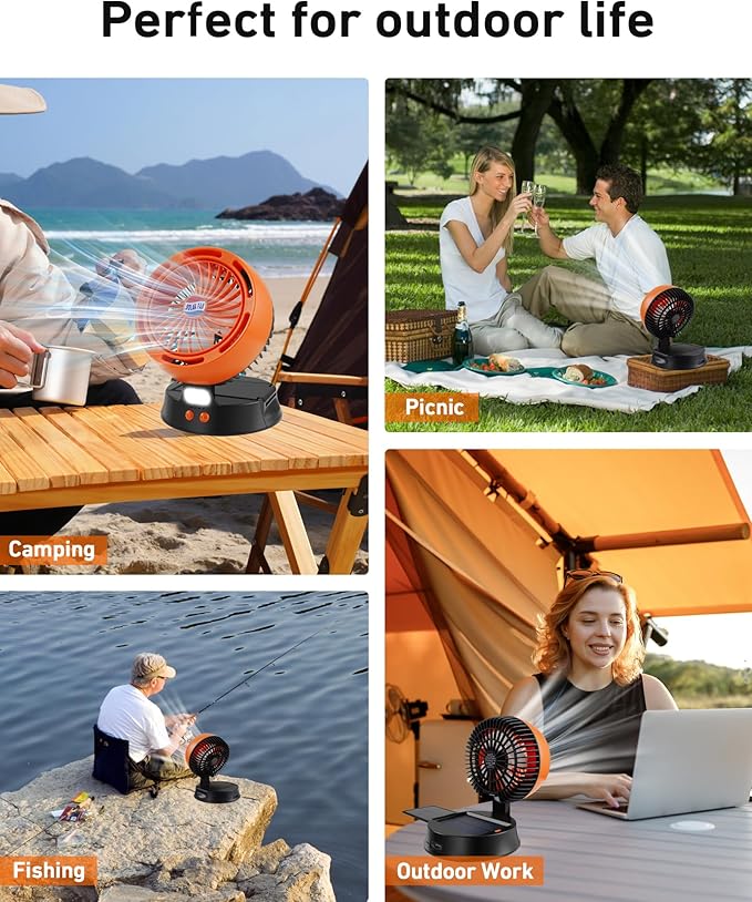 - β ππππππππππ π ππ ππππππ πππππππ - This upgraded air circulator fan, made from sturdy ABS material, serves as a tent fan, camping lantern, and emergency power bank. It ensures even airflow and illuminates your tent or campsite during nighttime adventures outside, making it a must have camping gear for all campers. This portable cordless fan can be 90Β° folded to stand as table fan, desk fan, suitable for indoor use as well for studying, working, reading, and more.