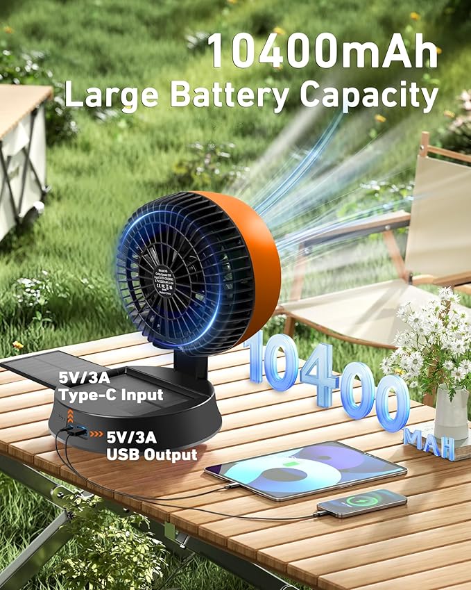 - β πππ πππππ π ππ ππππ ππππππππ πππππ ππππππππ πππππππ - Different from other low-quality products on the market, DUKUSEEK solar camping fan is built-in a 10400mAh rechargeable battery, which can work continuously for 8-36 hours, bringing you more lasting coolness. The personal battery powered fan supports charging and using at the same time. Great design for outdoor travel, gazebo, camping trip, power outage, hurricane ect.