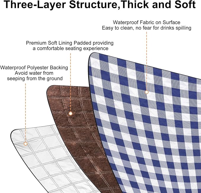 - Soft & Thick Three -Layer Structure: Our picnic blanket is crafted with a top layer of comfortable polyester fabric, a middle layer filled with plush microfiber, and a waterproof polyester film bottom, this three-layer construction, enhanced by high quality sewing technology, offers unmatched comfort and durability, ensuring that your picnic experience is as enjoyable as it is luxurious