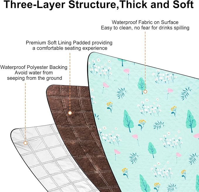 - Soft & Thick Three -Layer Structure: Our picnic blanket is crafted with a top layer of comfortable polyester fabric, a middle layer filled with plush microfiber, and a waterproof polyester film bottom, this three-layer construction, enhanced by high quality sewing technology, offers unmatched comfort and durability, ensuring that your picnic experience is as enjoyable as it is luxurious