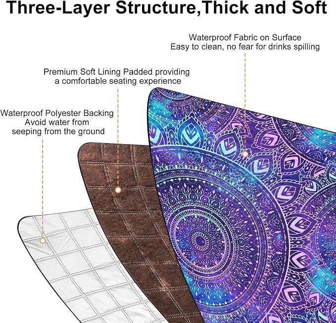 - Soft & Thick Three -Layer Structure: Our picnic blanket is crafted with a top layer of comfortable polyester fabric, a middle layer filled with plush microfiber, and a waterproof polyester film bottom, this three-layer construction, enhanced by high quality sewing technology, offers unmatched comfort and durability, ensuring that your picnic experience is as enjoyable as it is luxurious