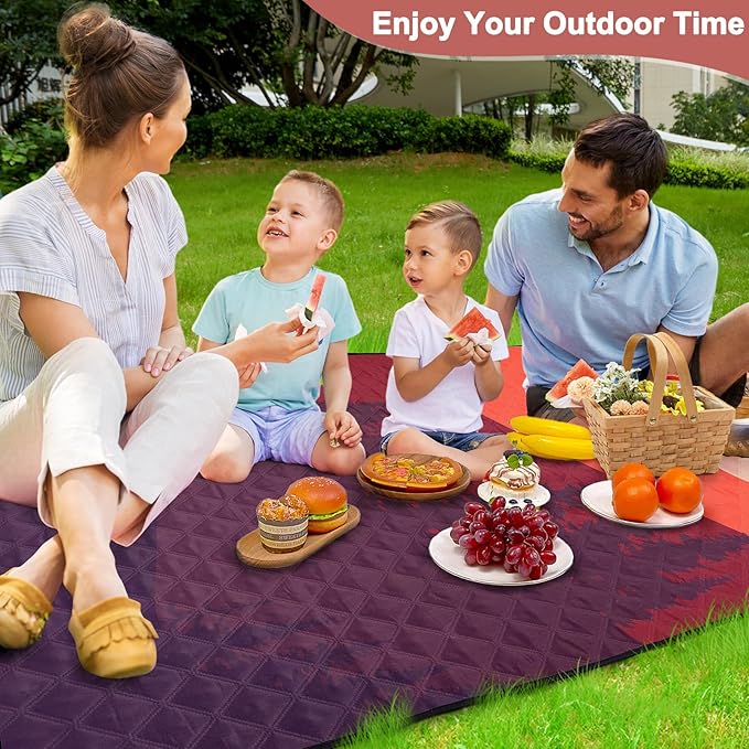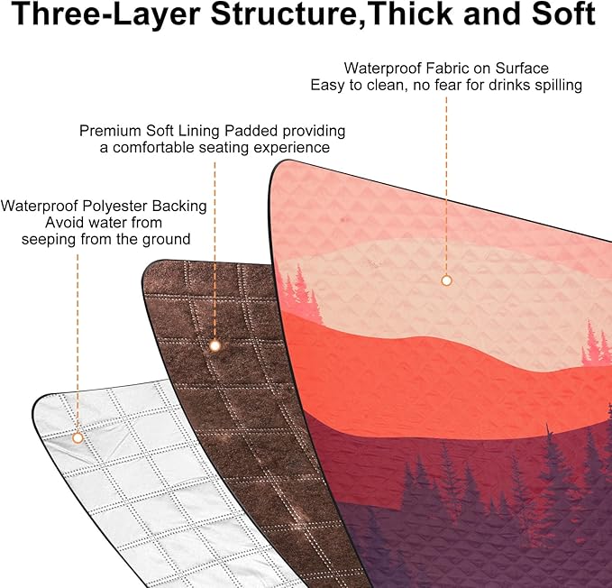 - Soft & Thick Three -Layer Structure: Our picnic blanket is crafted with a top layer of comfortable polyester fabric, a middle layer filled with plush microfiber, and a waterproof polyester film bottom, this three-layer construction, enhanced by high quality sewing technology, offers unmatched comfort and durability, ensuring that your picnic experience is as enjoyable as it is luxurious