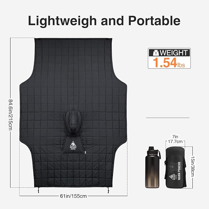 - Ultralight and Portable:: When unfolded, the honcho poncho measures 84.6 x 61 inches, but packs down to just 15 x 7 inches in its included compression sack. After folding and compressing, it becomes small and space-saving. Weighing only 1.54 lbs, this compact blanket poncho is lightweight, easy to fit in a backpack, and can even be used as a pillow, making it perfect for travel or camping