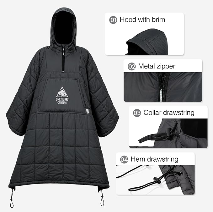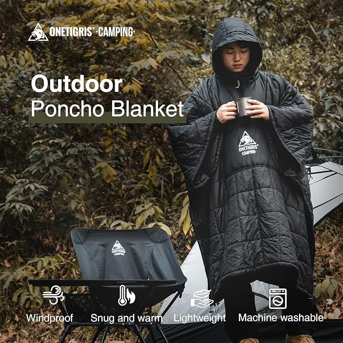 - Multifunctional Comfort: With buttons and elastic straps, OneTigris camping blanket effortlessly transforms into a poncho, sleeping bag, quilt, wearable blanket, or shawl. Slip on the drawstring hood, nestle your hands into the spacious pocket, and feel the warmth embrace you, all while staying free to move.
