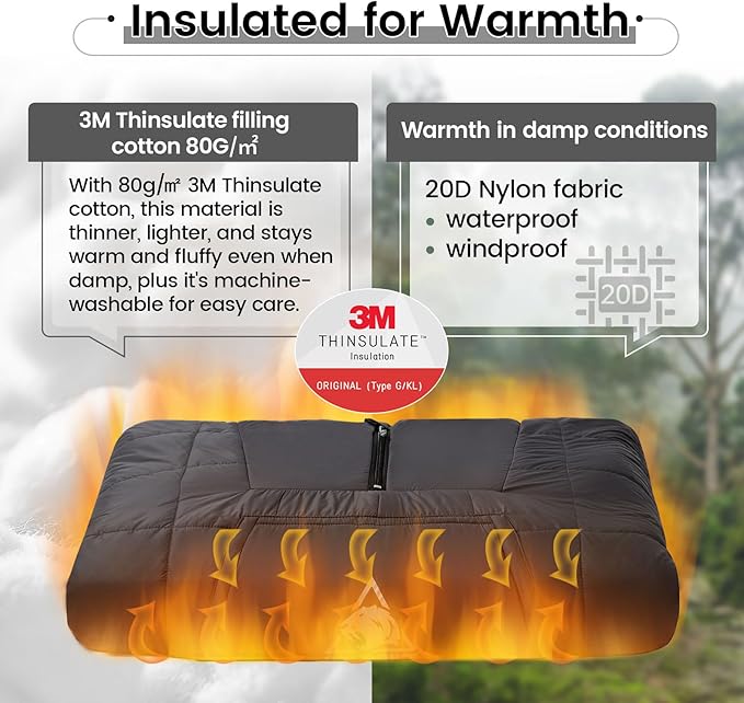 - 3M Thinsulate Insulation: Filled with 3M Thinsulate, this camping blanket delivers 1.5 times the warmth of down and double the loft of other materials.. Thin, lightweight, and machine-washable, it provides unbeatable insulation even in damp conditions, capturing body heat with ease. The 20D nylon fabric adds a soft, luxurious feel while offering waterproof, windproof, and breathable protection for all-weather comfort