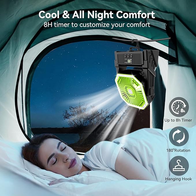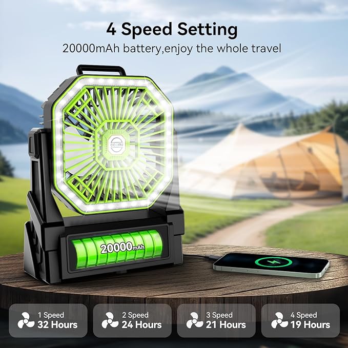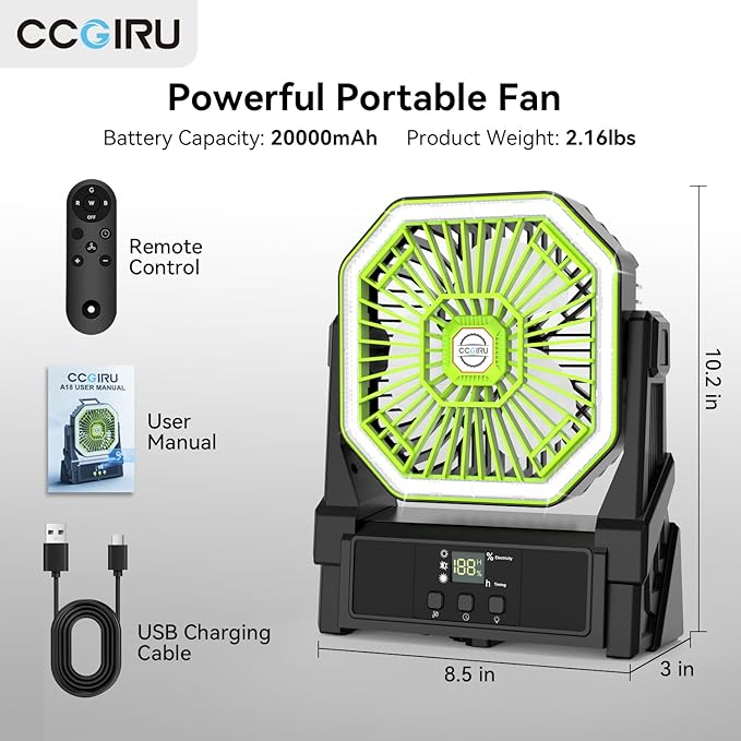 - Backup Power Function: This portable rechargeable fan with 20000mAh rechargeable battery is designed to better your outdoor experience, featuring as a backup power function with the USB type C cable included. Plug and power up, makes it a must-have camping accessory, offering a cool breeze
