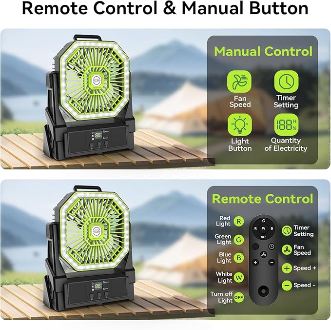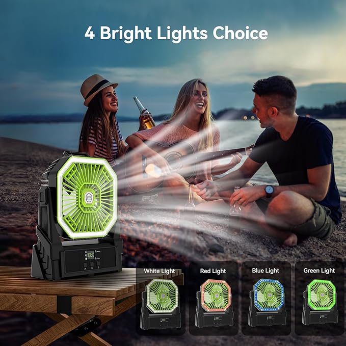 Portable Battery Powered Fan with 4 Lights, 20000mAh Battery Operated Fans with Remote, Outdoor Camping Fan Rechargeable, 4 Speed, 4 Timer for Picnic, Barbecue, Fishing, Home