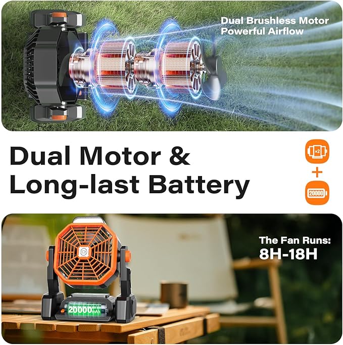 - Dual Brushless Motor & Strong Wind: The camping fan rechargeable adopt dual motor design to produce more powerful airflow than fans of single motor. In addition, this battery operated fan equipped with brushless motor, which makes it less noise than fans with brush motor for keeping you cool and comfortable during hot summer days or in stuffy indoor